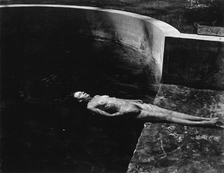 This approach, with a difference, is also evident in "Nude Floating, 1939". One would have a hard time trying to describe the woman in the pool: a precocious young girl or a goddess of the water, a nymphet lost in her daydream or one's cousin taking a swim? Ambiguity is the most prominent aspect of the image, yet only a starting point for its power. The way I see it, even the girl's face changes expression depending on how the photograph is viewed: in its intended horizontal position it has the transcendent poise of a Buddha; if the image is rotated vertically, something disquieting, stilted and uneasy is evident in the expression. Furthermore, through compositional treatment and the grey scale of the print, the sensuality of the nude female form is downplayed, yet not obliterated. It is interesting to note how the dapple-shade water ripples caress the body inviting it to a splash in the sun, yet the woman's pose is as stiff as that of a corpse...
